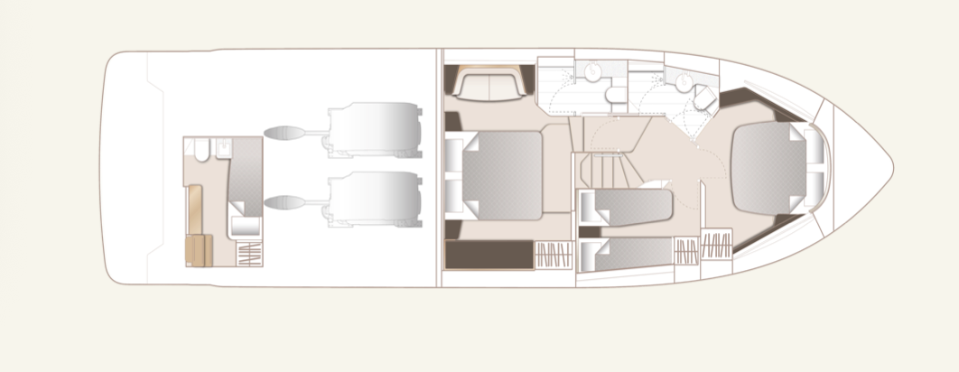 Jusqu’à six invités peuvent être logés dans trois cabines luxueuses, dont une suite propriétaire pleine largeur située au centre du bateau. De larges hublots de coque apportent une lumière naturelle abondante et renforcent la sensation d’espace.